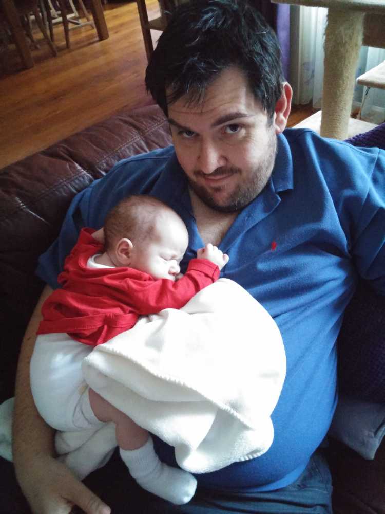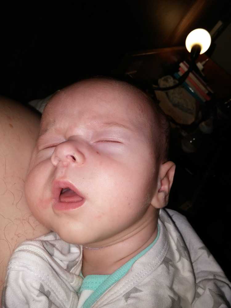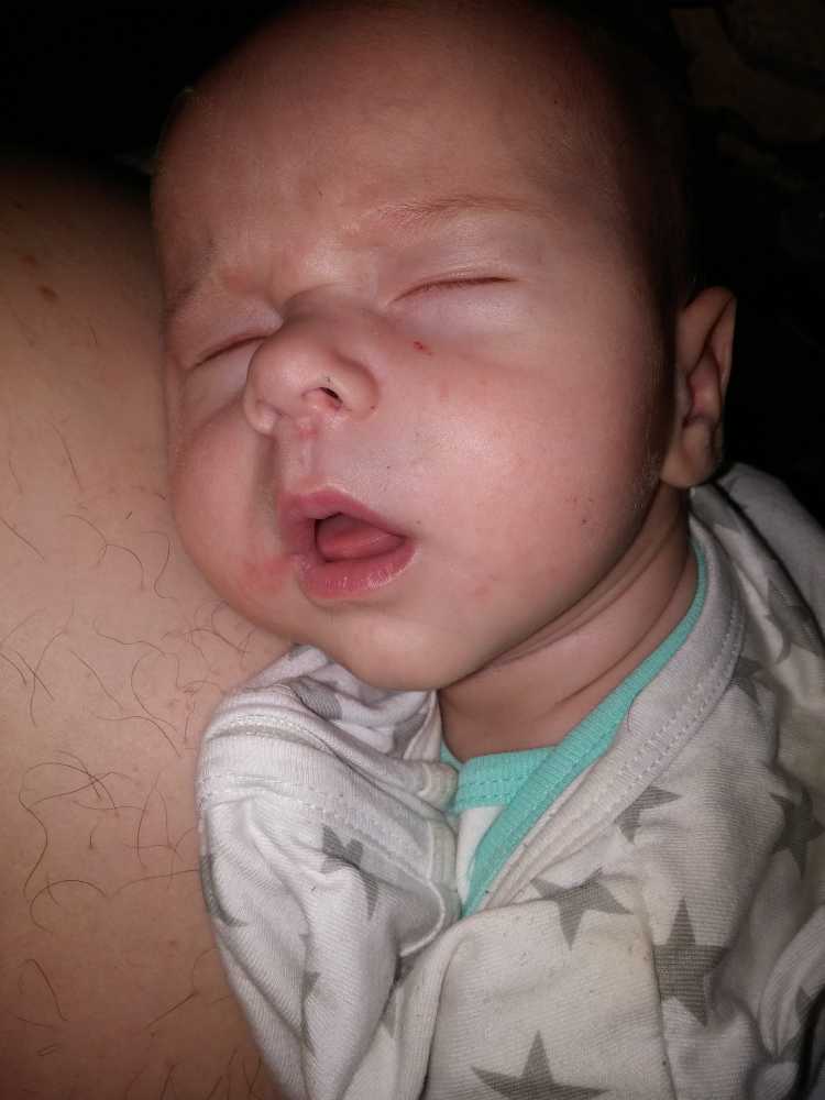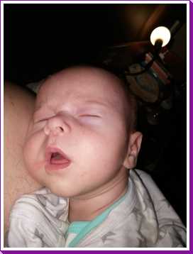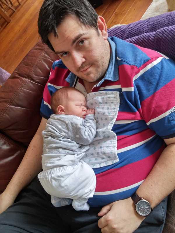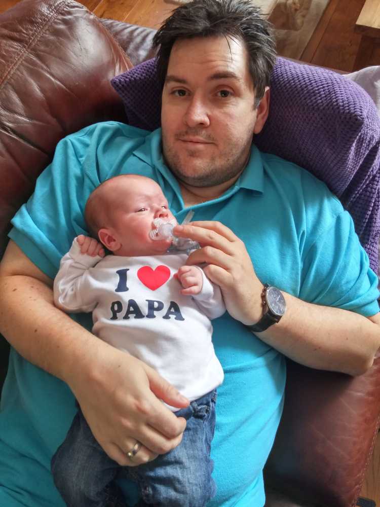 Na zo'n vermoeiende dag kan ik het niet meer opbrengen om na mijn laatste fles te boeren, dus ik val gewoon bij papa op de schouder in slaap.