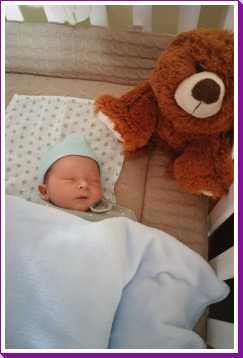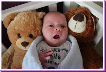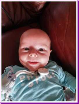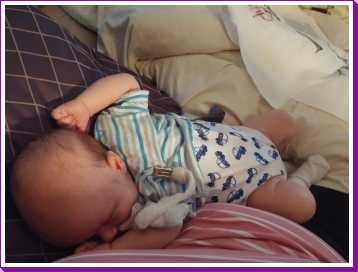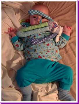 6 september: Vanochtend mocht ik nog even bij papa en mama in bed liggen. Maar jah, na mijn fles moet ik echt even zitten om een boertje te laten, ik ben dus maar tegen papa aan gaan zitten, dat is een goed kussen.