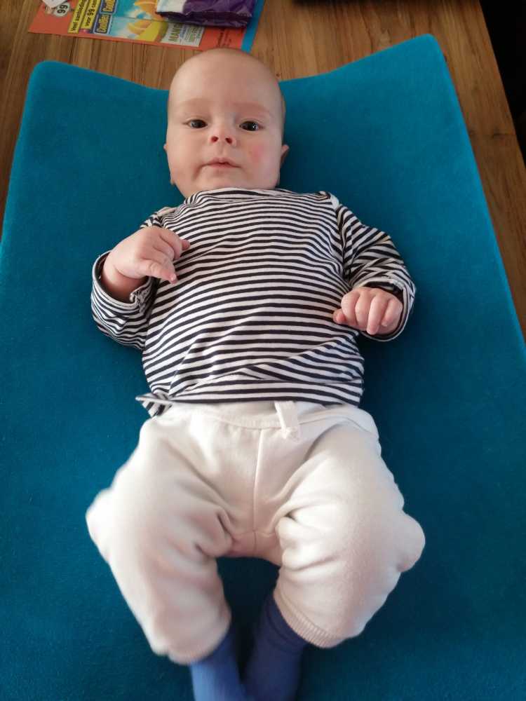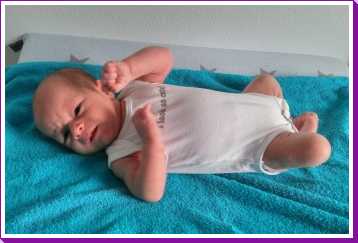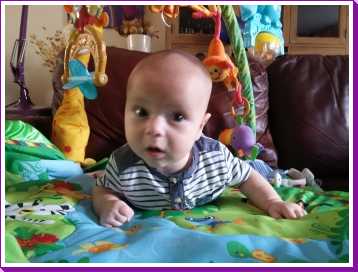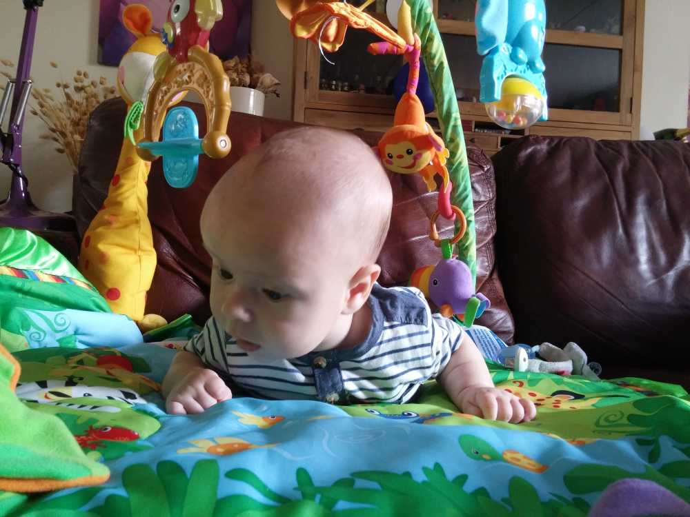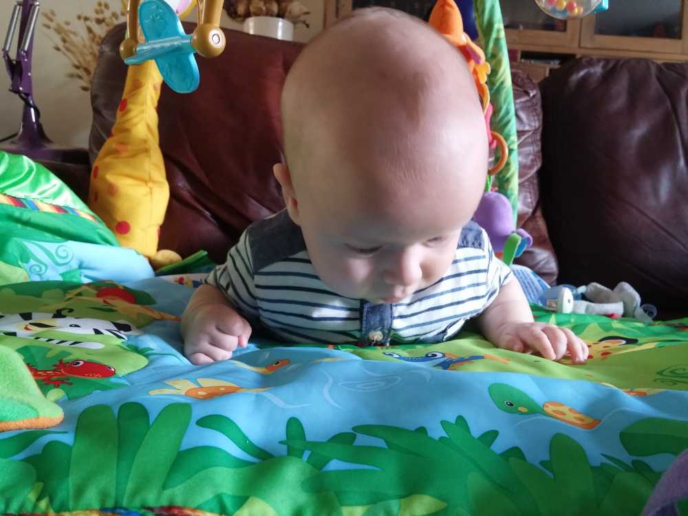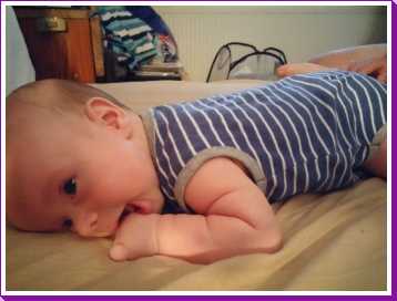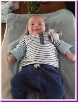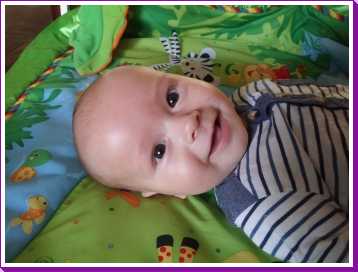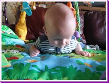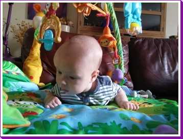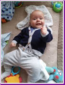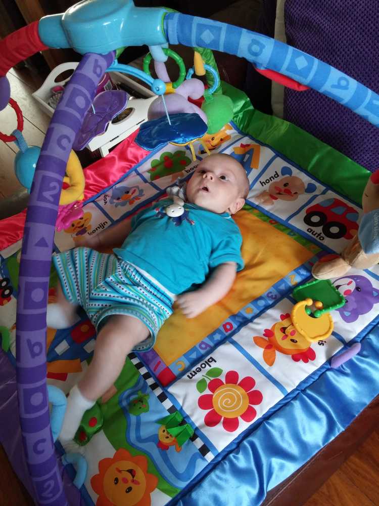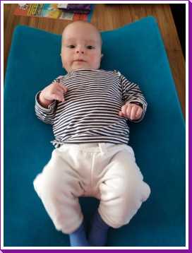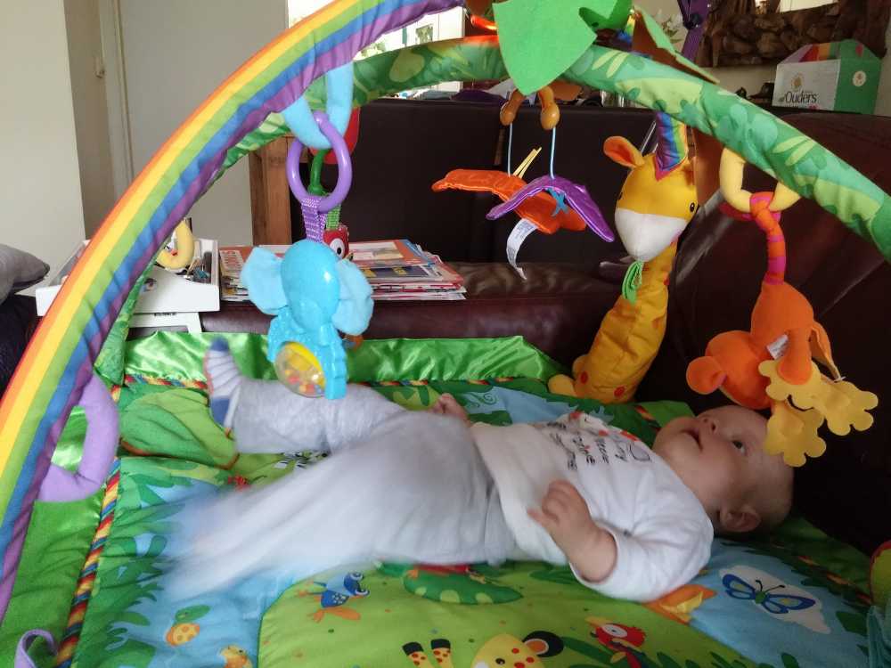 1 september: Vanochtend ben ik met mama en oma bij Patricia Kleij geweest. Eenmaal thuis daarvan heb ik op mijn buik liggen oefenen met draaien op het speelkleed op de bank. Mama zat naast me dus er kon niets gebeuren.