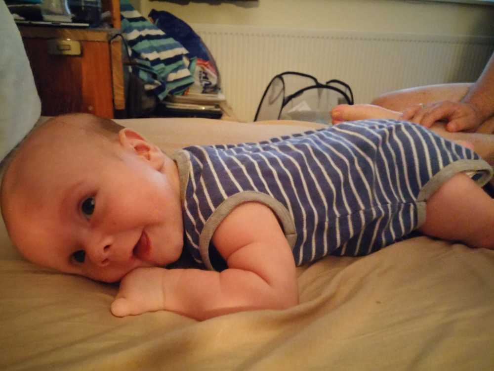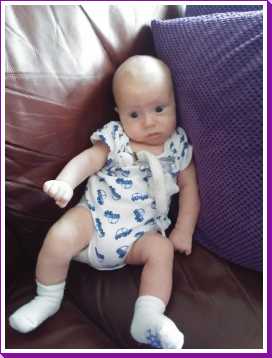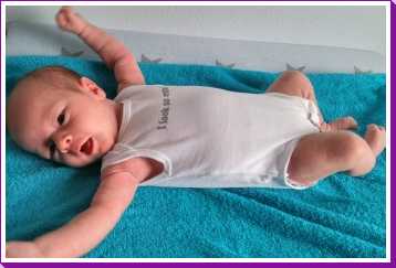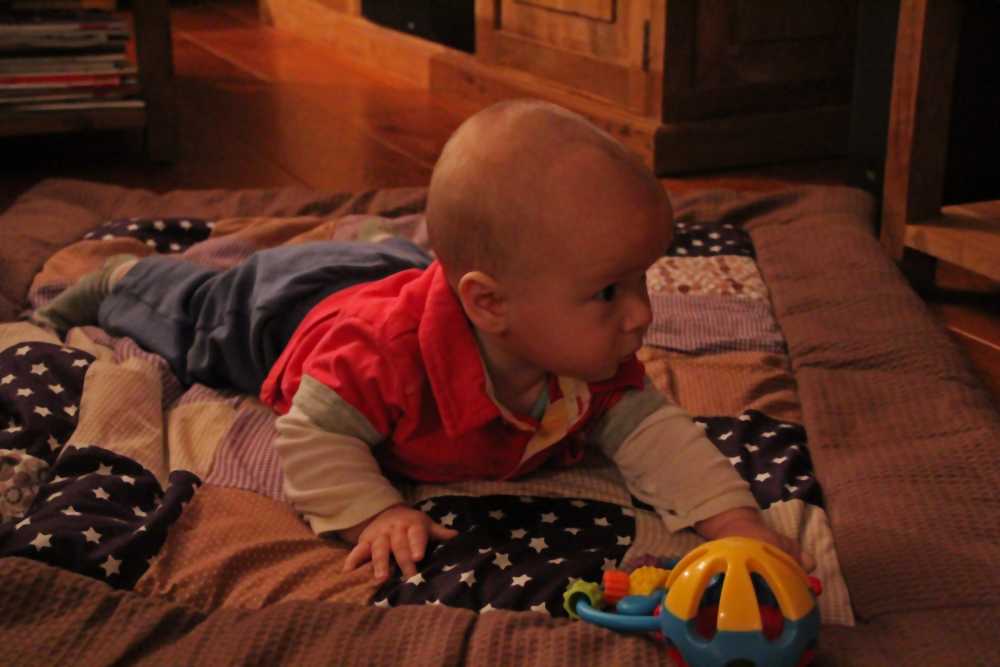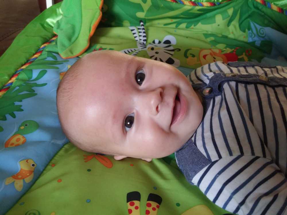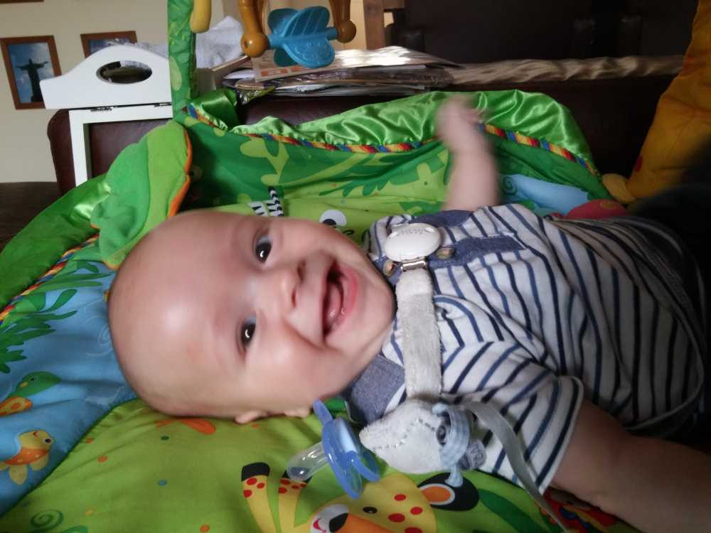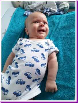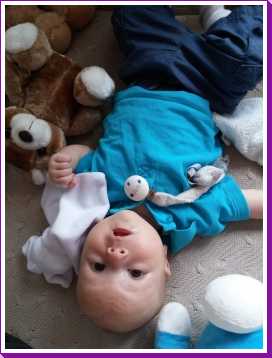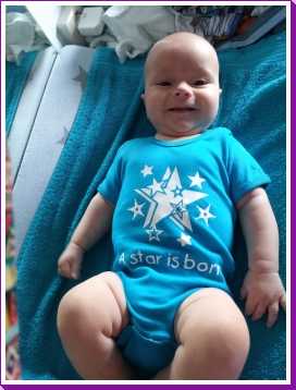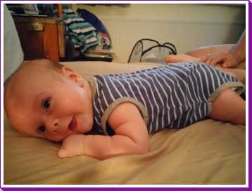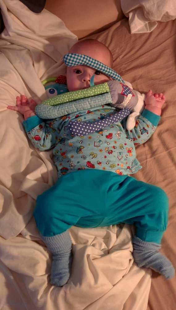 1 september: Vanochtend ben ik met mama en oma bij Patricia Kleij geweest. Eenmaal thuis daarvan heb ik op mijn buik liggen oefenen met draaien op het speelkleed op de bank. Mama zat naast me dus er kon niets gebeuren.