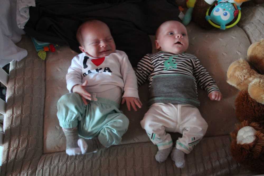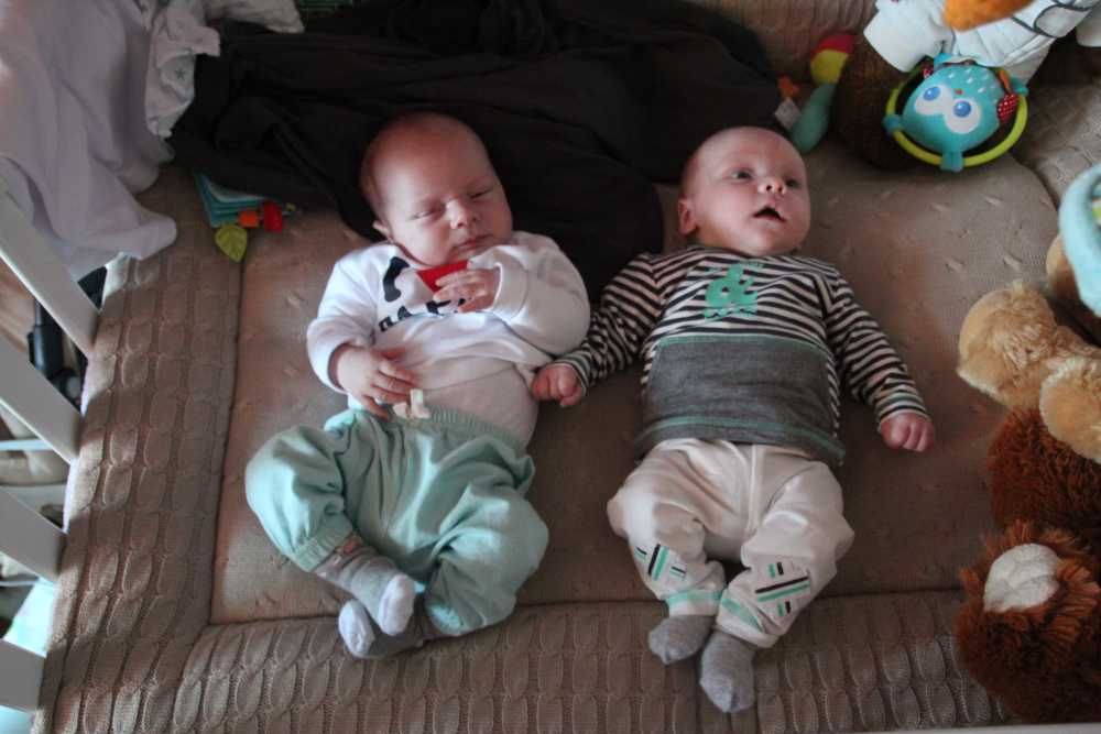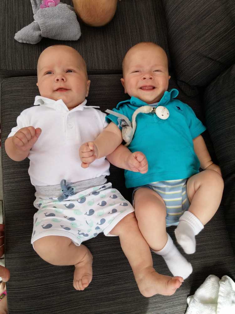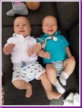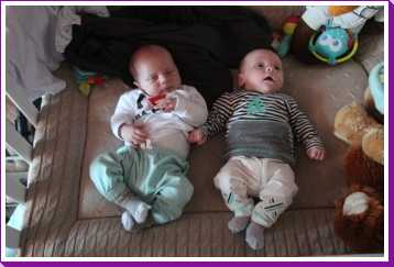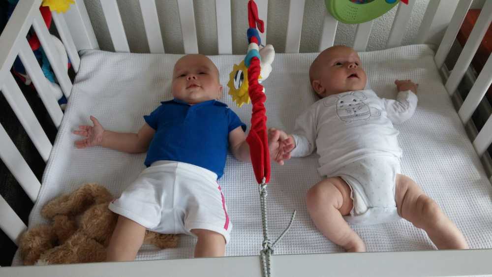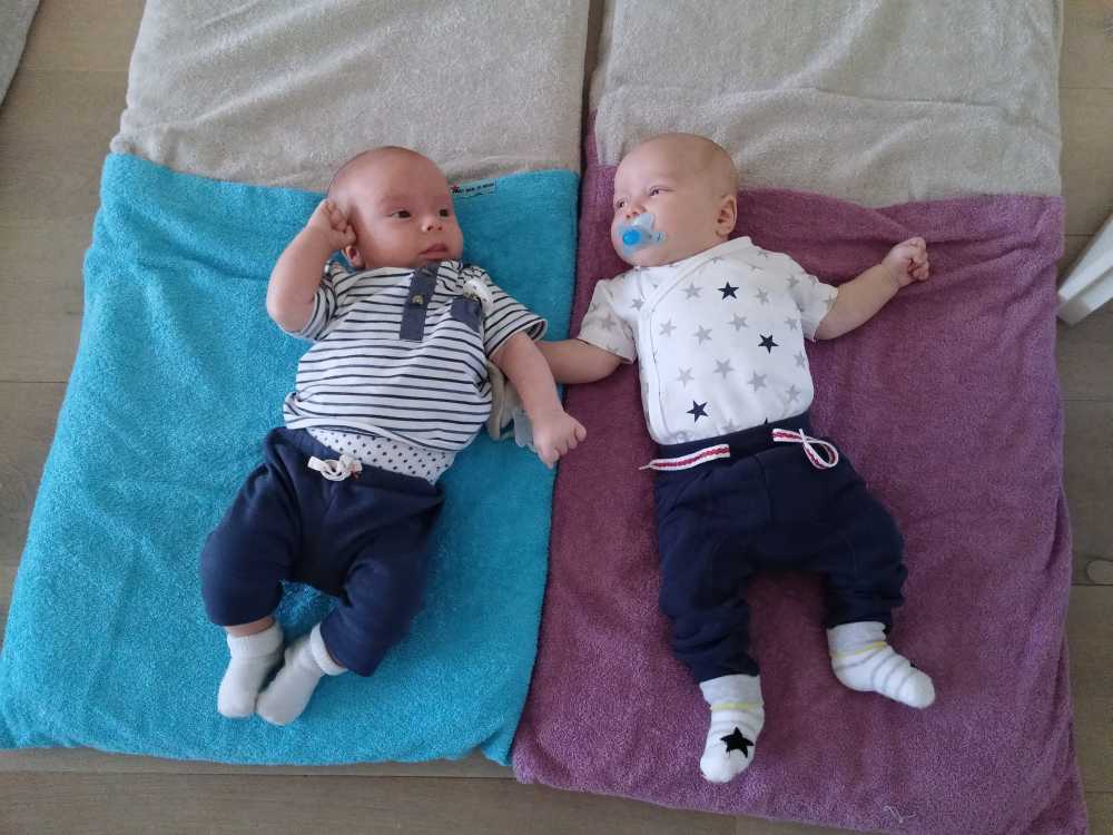 7 juni: Vanmiddag kwamen Sven & Marjolein langs op kraamvisite. Zelf zijn ze eind april ook weer opnieuw ouders geworden van zoon Jens. Die moesten natuurlijk ook even naast elkaar in de box gelegd worden. Jens is dan wel drie weken ouder, maar Youp was bij de geboorte al langer en zwaarder dan hij. Dat is ook goed te zien.