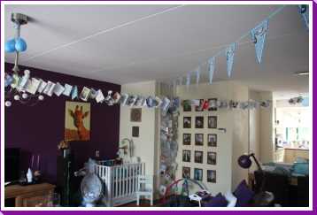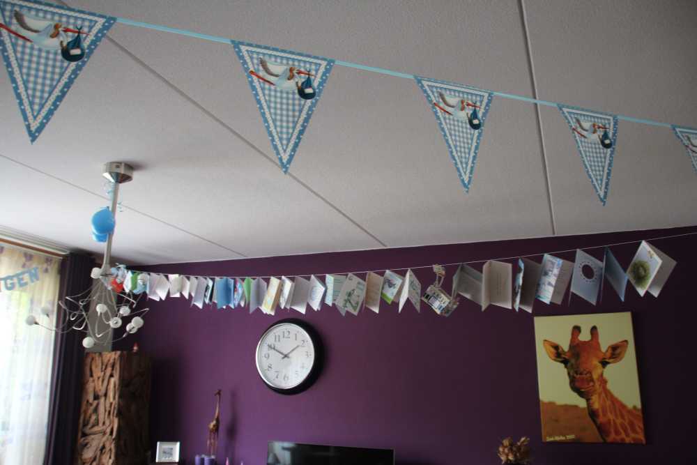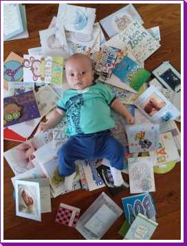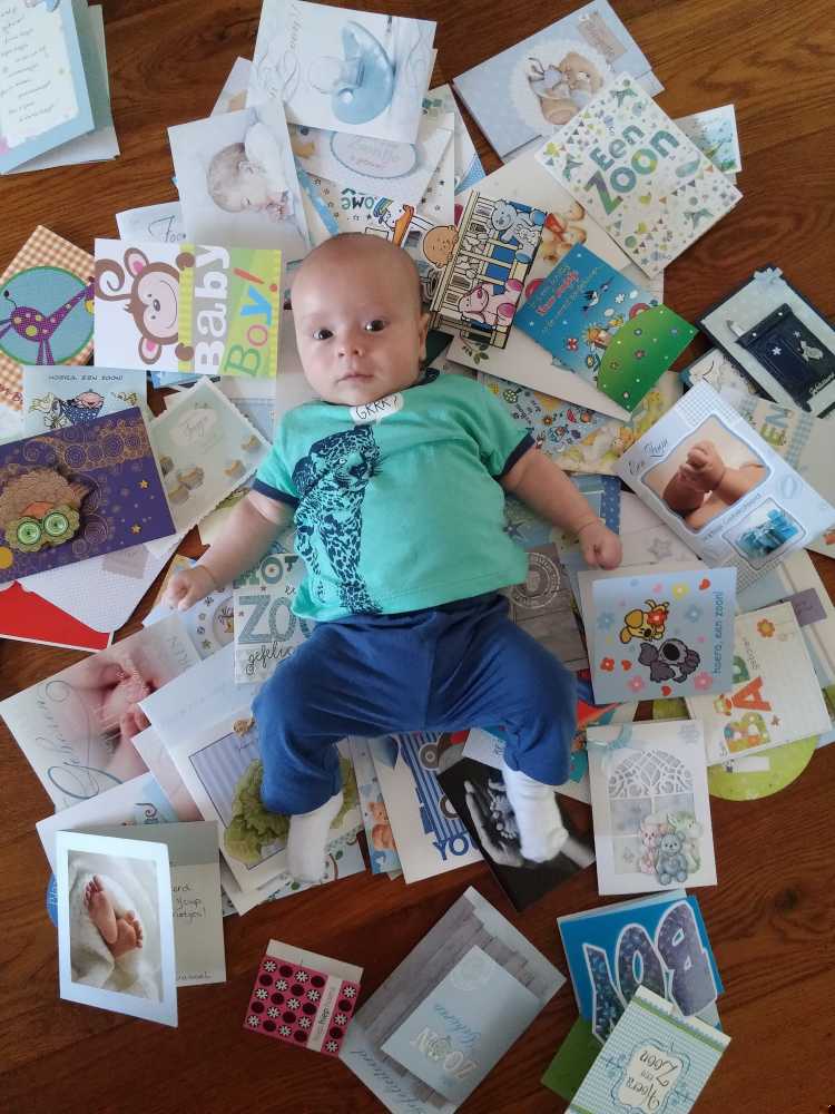 16 juli: Vandaag mocht ik weer met mama naar de babymassage. Daarna thuis nog even alle kaarten die ik gekregen heb op de foto gezet. Toen nog even gechilt op mijn speelkleed totdat papa thuis kwam.