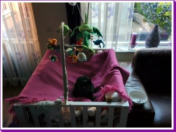 12 november: Het is harstikke leuk om thuis lekker in de box te liggen en lekker geluidjes te maken......