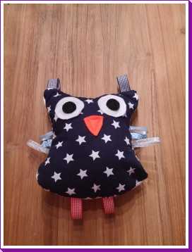 31 augustus: Mama heeft vandaag weer een nieuwe uil gemaakt voor mij voor in de box. Compleet zelfs met een belletje er in. Hij is mooi geworden hé..........