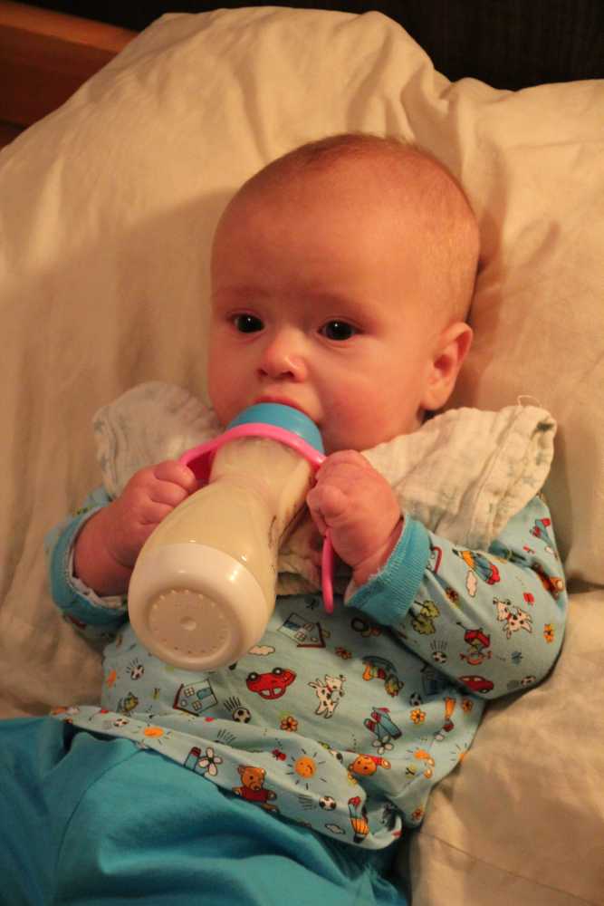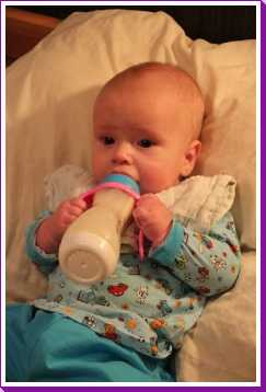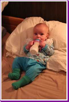 8 oktober: Ik kan inmiddels al zelfstandig mijn fles drinken, gewoon lekker liggend op bed.........