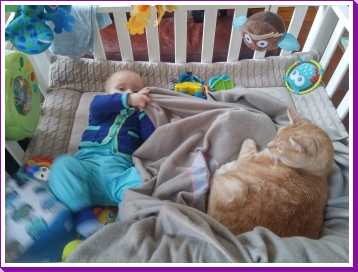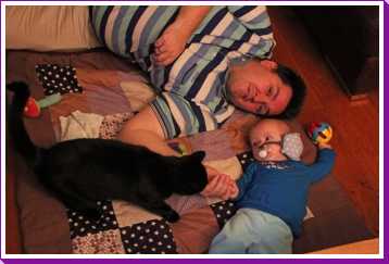 19 oktober: Met papa op mijn speelkleedje en dan komt ook Poekie nog kijken, interresant, interresant.......