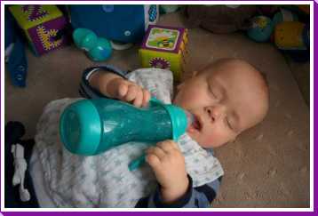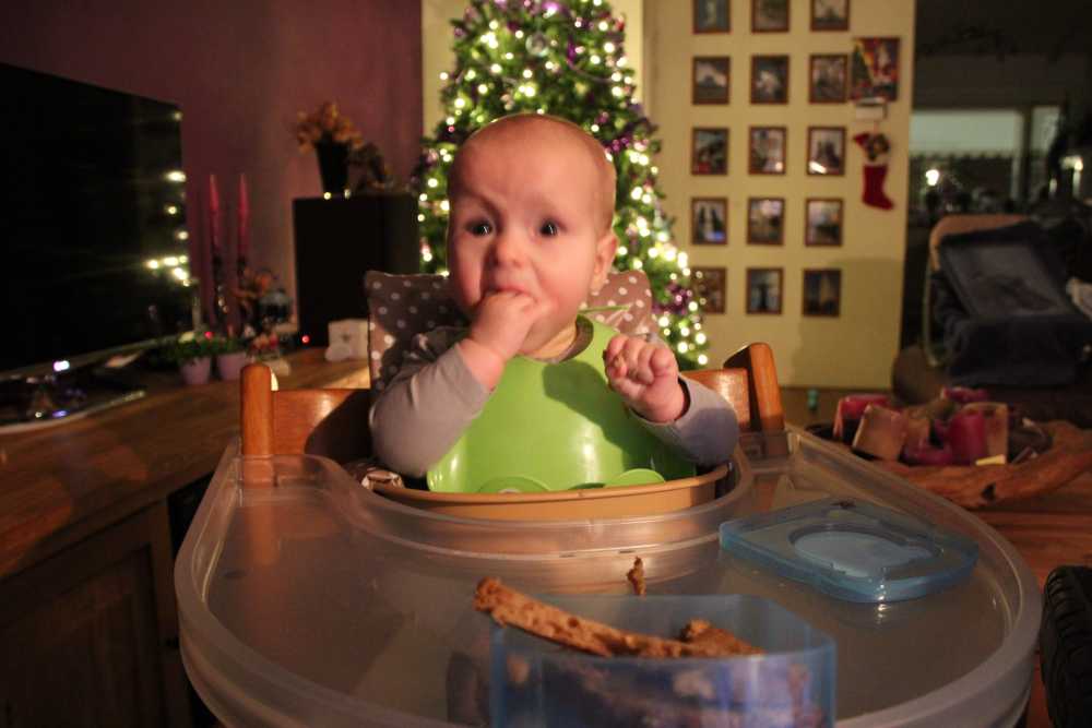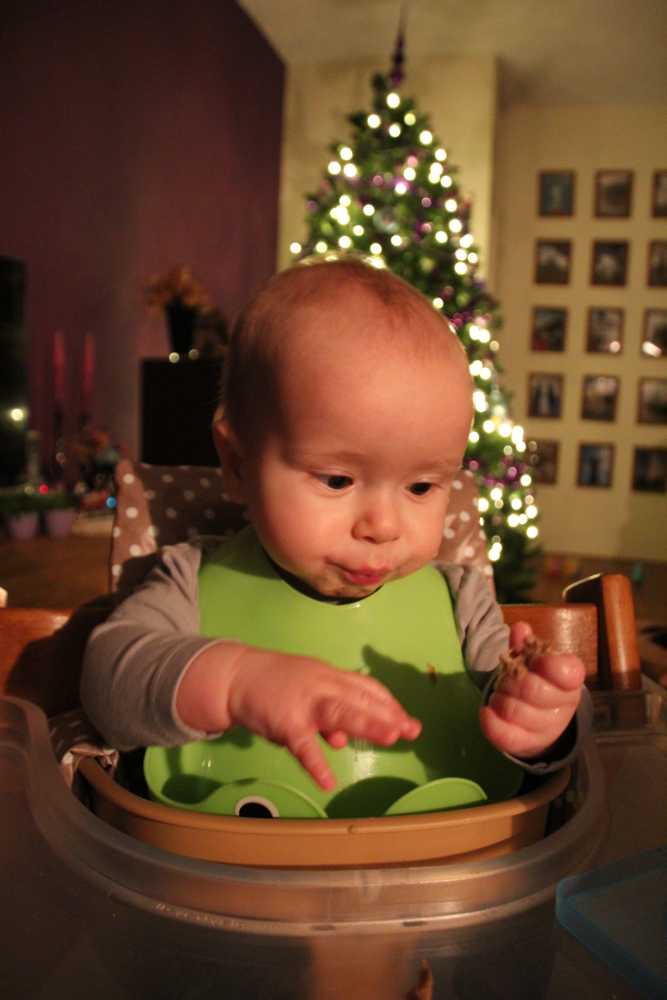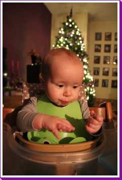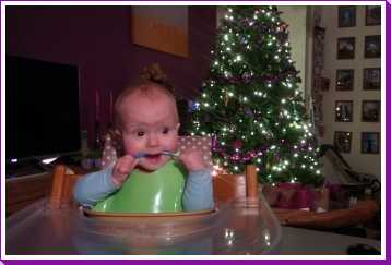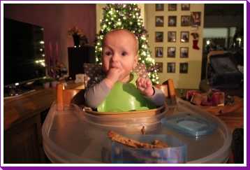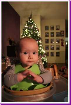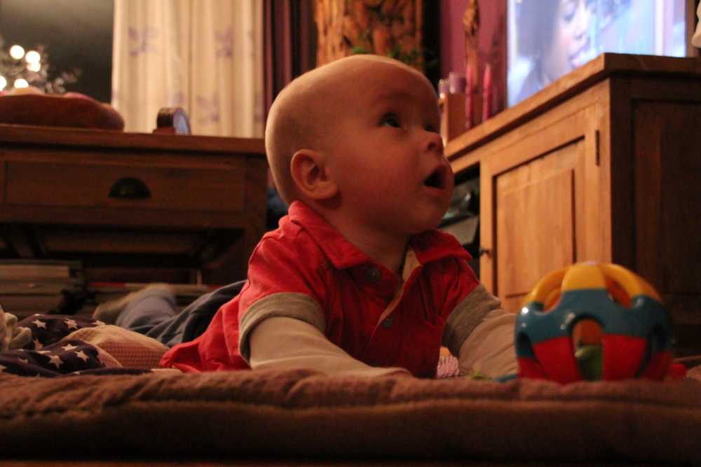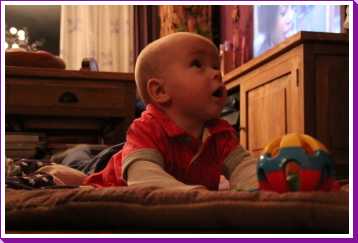10 december: Overdag heb ik lekker met mijn nieuwe blokjes gespeeld. Daarna heb ik 's-avonds even met papa TV gekeken vanuit mijn eetstoel. Toen ik daarna de fles kreeg in de box vond ik het welletjes en ben ik met fles en al in slaap gevallen.....